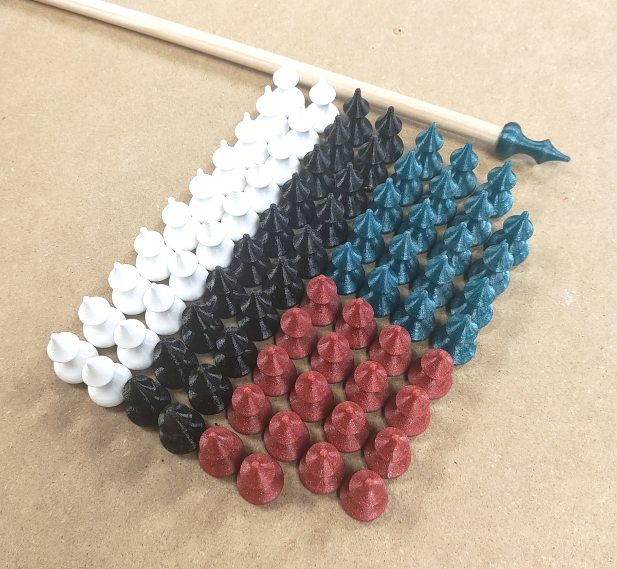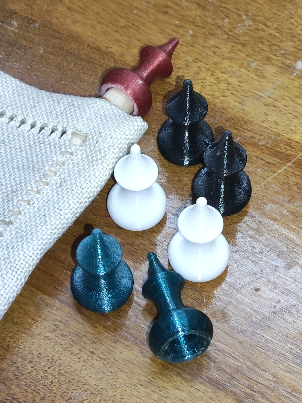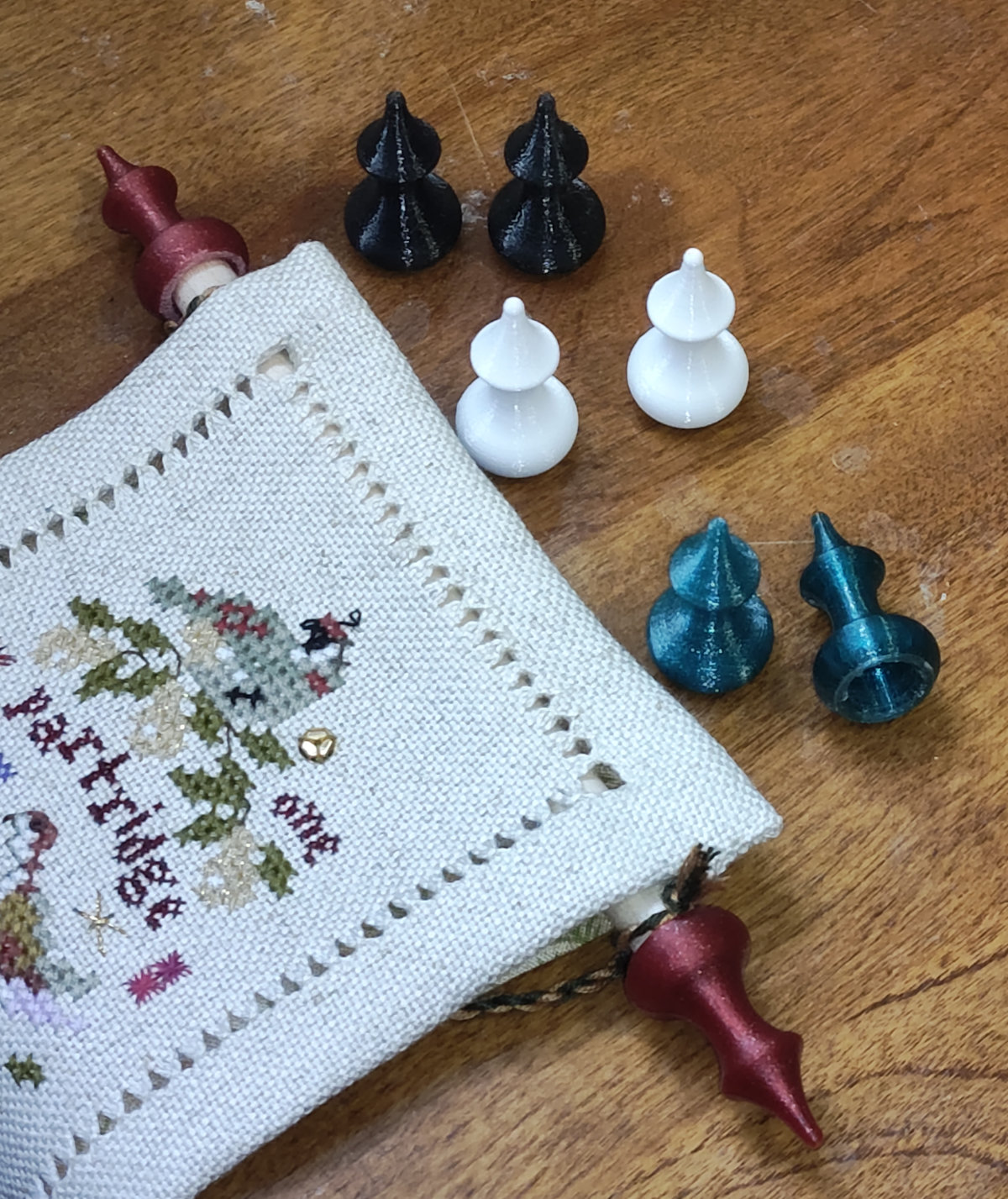 These 3D printed finials fit standard 3/8″ (9.5 mm) wooden dowels. They have a 1/4″ pocket that is a snug fit. Cut a dowel to the width of your art piece, add a half inch, and you will have a perfect hanger. A hanging cord can be tied with a loop at each end.