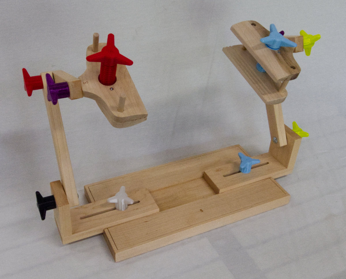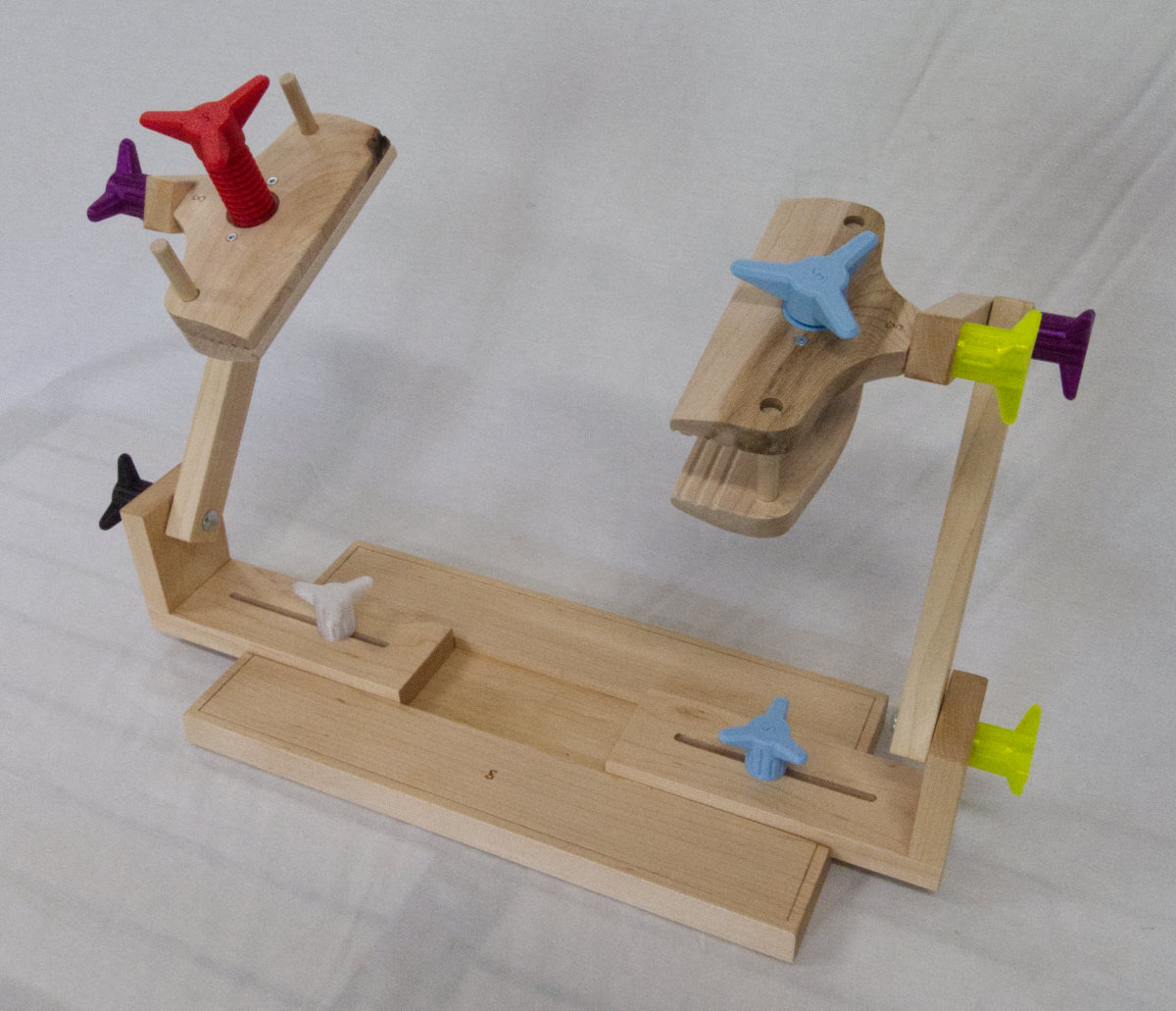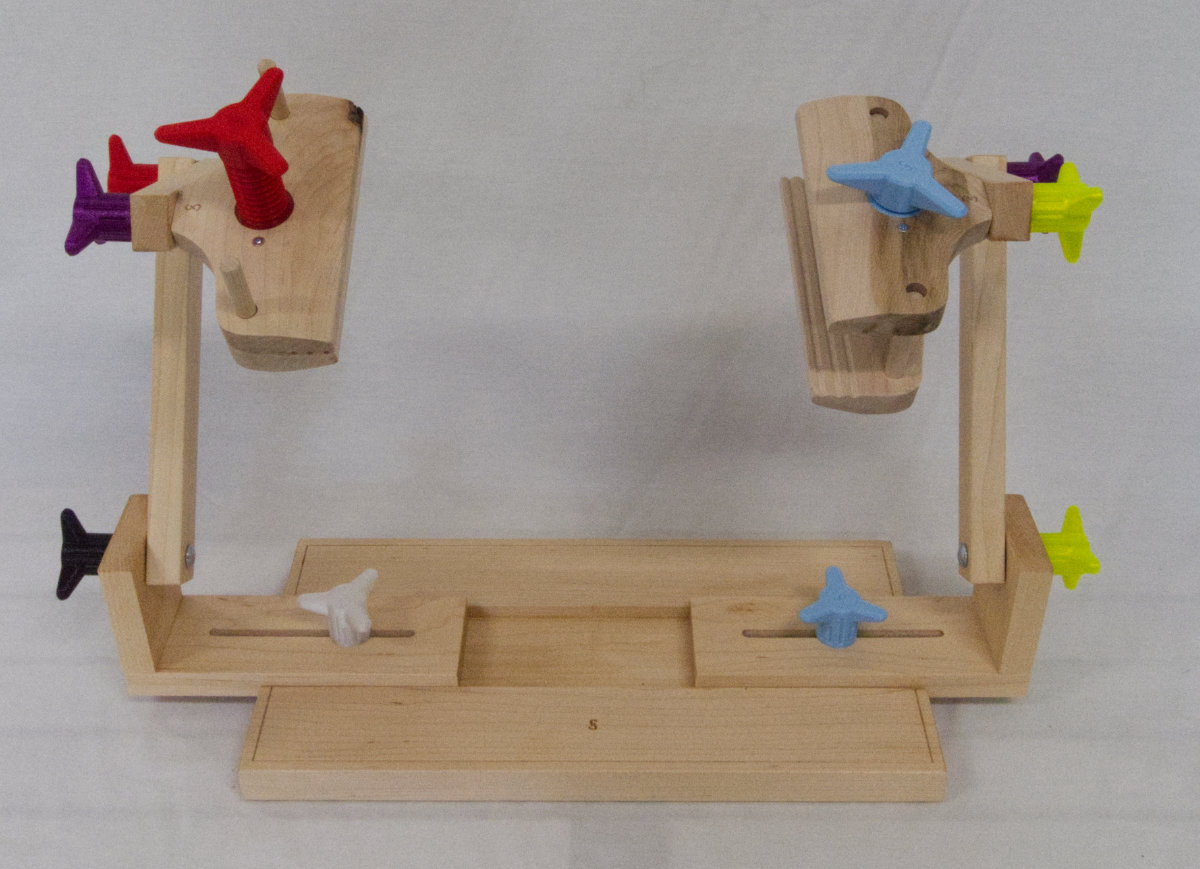 All wood is Maple, with Poplar or or other domestic North American wood used for dowels and shafts. All parts are sanded to 120, the base to 220. The lower smoothness of the clamp and sidebars assists in maintaining selected positions. The sidebars and base are finished with a coat of Hard Wax Oil. The clamps and knobs are left unfinished to avoid any staining or contamination of your work. Unless specified by you, we will ship matching parts from our inventory. For example, your stand will be all Maple, but may also feature Spalted Maple or otherwise figured sidebars and clamp. Since each stand is hand-made, please expect yours to be unique.